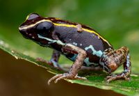 Ein (Pfeil)Giftfrosch der Art "Phyllobates lugubris", was soviel wie "düsterer Blattsteiger" bedeutet. Die generelle Bezeichnung "Pfeilgiftfrosch" im Deutschen ist etwas irreführend, da nur drei sehr spezifische Arten giftig genug sind um mit deren Giftsekret Blasrohr-Pfeile für die Jagd zu imprägnieren. Eigentlich sollten sie "Giftfrosch" heissen.