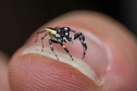 Die durchschnittliche Größe einer Springspinne beträgt etwa 6 mm. Das ist ziemlich klein, und um dies zu veranschaulichen, sehen Sie hier ein erwachsenes Männchen der Art "Phintelloides versicolor", das auf dem kleinen Finger meiner linken Hand sitzt. Normalerweise berühre ich meine kleinen Freunde aus verschiedenen Gründen nicht. Der wichtigste ist, dass ich diesen kleinen Kreaturen keinen Schaden zufügen möchte. Im Feld verwende ich oft Mückenschutzmittel, was auch Spinnen nicht gut tun würde. In diesem Fall hüpfte der kleine Kobold auf meine Hand, gleich nachdem ich ein Restaurant ausserhalb von Chiangrai in Thailand verlassen hatte, in dem ich zu Mittag ass. Mit sauberen Händen konnte ich also nicht widerstehen diese Aufnahme als Größenreferenz zu machen.